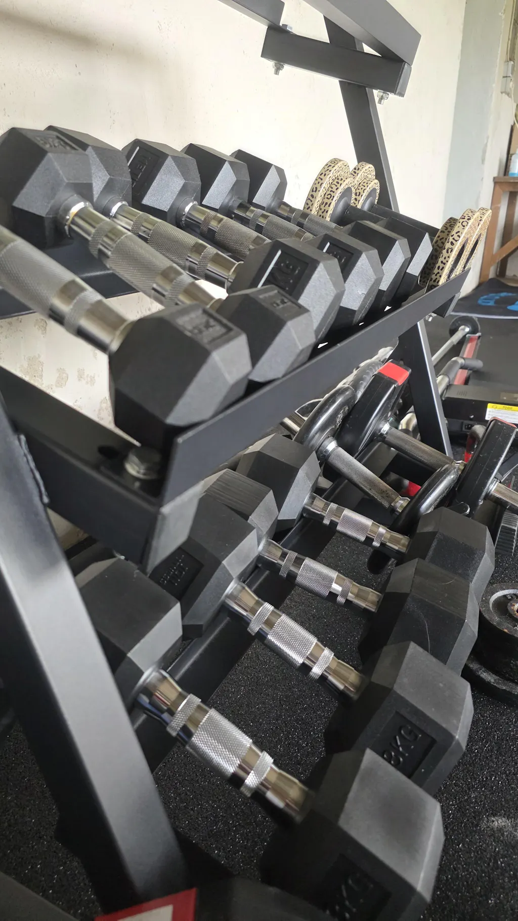 Egal ob Hanteln in runder oder Hexagon-Form, alle gängigen Modelle passen optimal auf einer der drei Ablagen. Damit behältst du den Übersicht und hast deine Hanteln sofort griffbereit. Die geneigten Aufnahmen erleichtern das Herausnehmen und Ablegen der Hanteln zusätzlich.