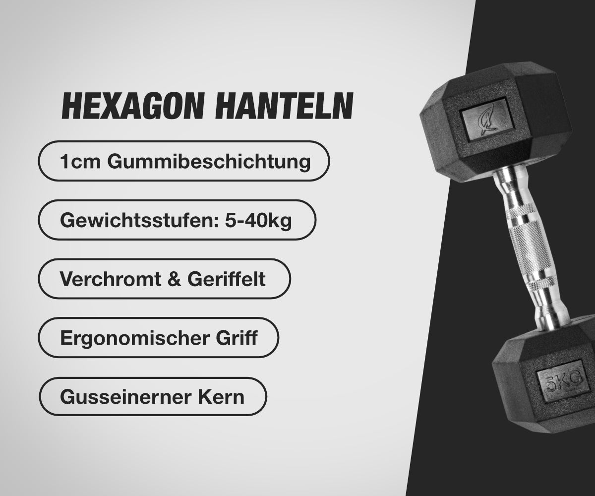Besonders gut geeignet sind Hexagon Hanteln für funktionelles Training, z. B. für Übungen wie Renegade Rows oder Push-Ups auf Hanteln – sie bieten jederzeit eine stabile Basis. Durch die kompakte Form können die Hexagon Hanteln platzsparend gelagert werden. Passend dazu empfehlen wir unseren Climaqx Hantelständer.