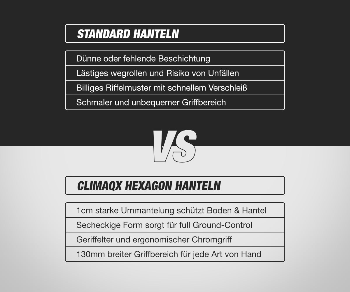 Die Climaqx Hexagon Kurzhanteln in verschiedenen Gewichts-Ausführungen ermöglichen dir im Vergleich zum Gerätetraining, Übungen mit einem weit größeren Bewegungsradius auszuführen. Diese hochwertigen Kurzhanteln mit einem Gusseisernen Kern wurden mit einer Gummi-Ummantelung versehen: Dadurch erhöht sich die Lebensdauer signifikant und Schäden, beispielsweise durch Fall aus großer Höhe, werden an Hanteln und am Boden vermieden.