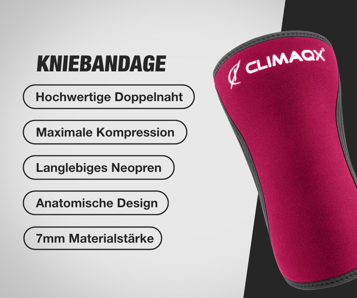 Climaqx Kniebandagen aus 7mm SBR Neopren sorgen durch Ihre hohe Kompression für maximalen Halt & Stabilität deiner Kniegelenke, um Verletzungen proaktiv vorzubeugen. Ideal für jene, die auf schwere Trainings nicht verzichten möchten.
